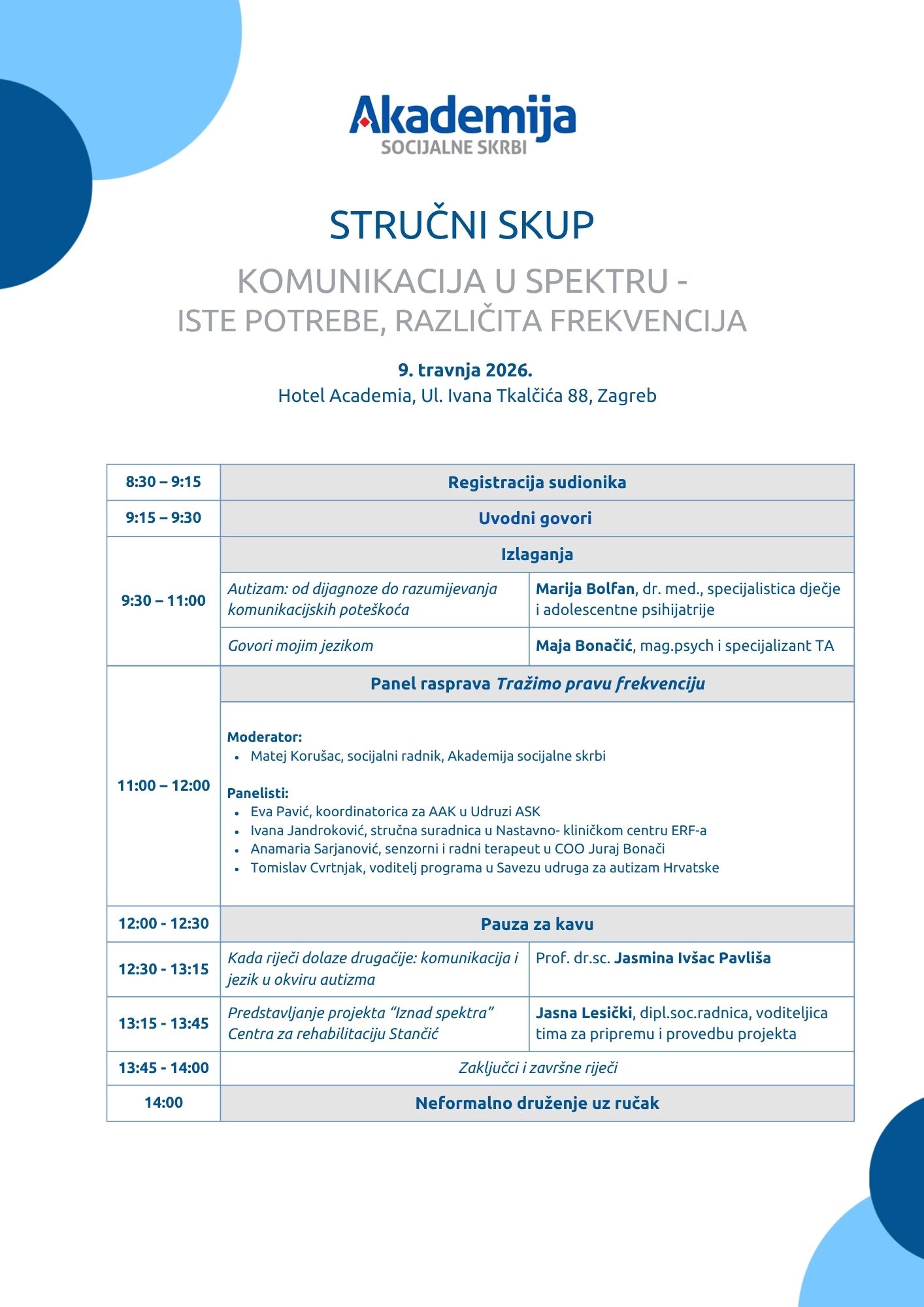 Stručni skup koji će se održati 9. travnja 2026., u Zagrebu, Hotel Academia, Ul. Ivana Tkalčića 88, namijenjen je stručnim radnicima u djelatnosti socijalne skrbi koji u svom svakodnevnom radu komuniciraju s osobama u spektru autizma.